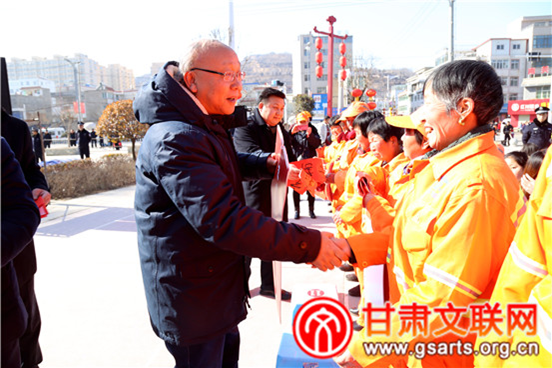 演出前省政协副主席郭天康为环卫工人和现场观众发送春联和“福”字